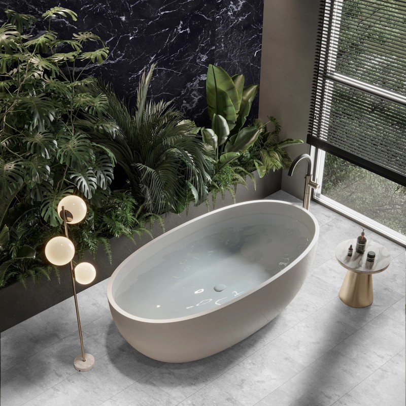 Panou Decorativ Impermeabil SPC Rocko Tiles Concrete R109 cu efect de beton, un trend in designul interior de mai multe sezoane. Acum acum se regăsește și în cea mai nouă generație de plăci de perete de format mare SPC (Compozit Piatră cu Polimer) care imită perfect betonul brut din colecția Rocko Tiles. Miezul produsului este realizat din peste 70% marmură naturală, iar suprafața este finisată cu un strat decorativ acoperit cu lacuri UV de înaltă calitate. Plăcile sunt ideale pentru instalarea în baie și camere cu umiditate crescută, deoarece sunt impermeabile. Ele pot fi, de asemenea, folosite pentru a termina bucătăria în loc de gresie pe suprafața dintre dulapurile superioare și inferioare.